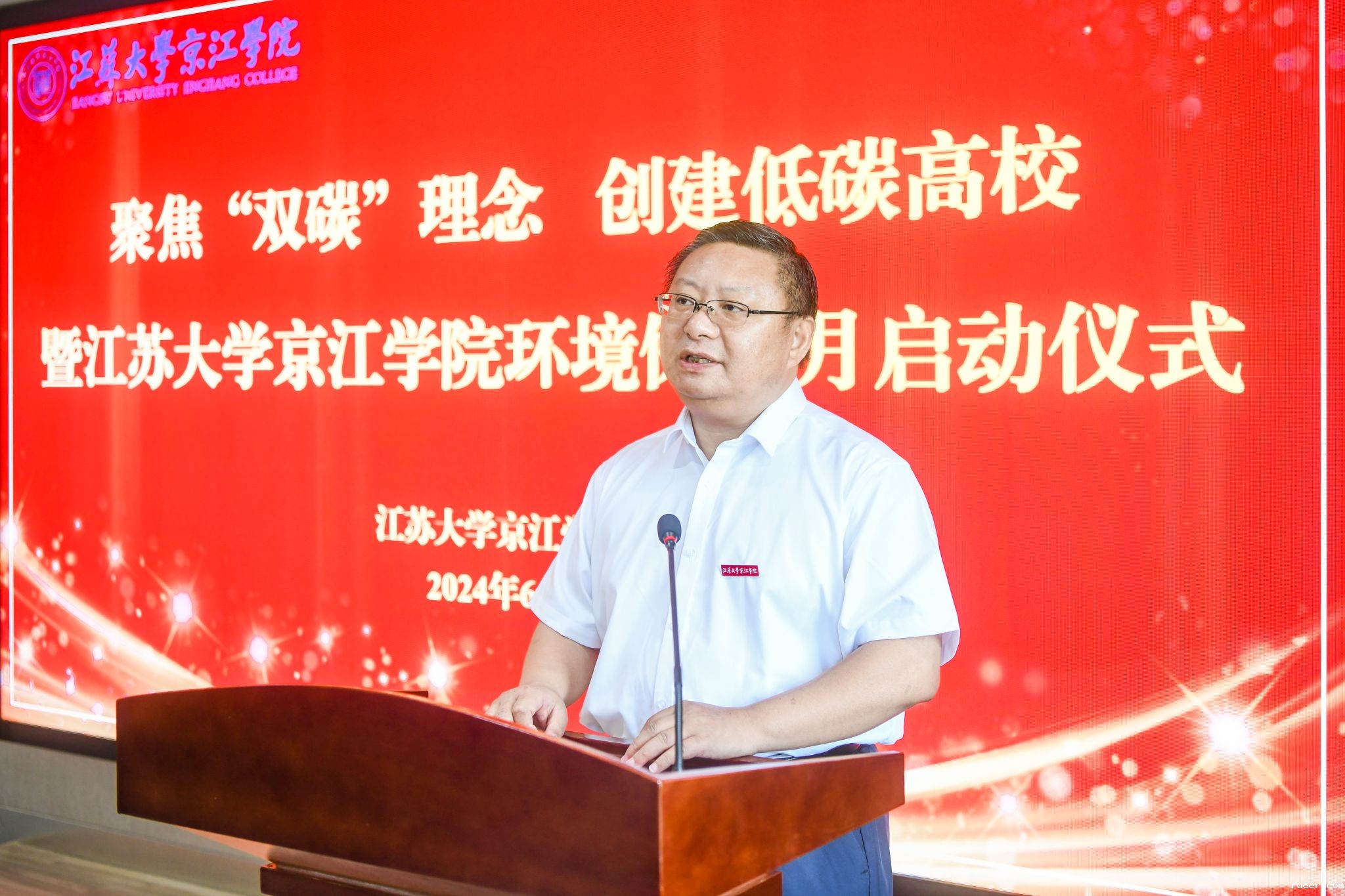 On June 3, Jingjiang College held the launching ceremony of focusing on the "dual carbon" concept and creating a low-carbon college and the environmental protection month of Jingjiang College of Jiangsu University to further promote the taking root of Xi Jinping's thought on ecological civilization. Chen Changzhi, deputy director of Zhenjiang Ecological Environment Bureau, Tong Manping, director of Climate Change Response Office of Zhenjiang Ecological Environment Bureau, all college leaders, alumni representatives, Zhou Junjun, executive director and general manager of Hefei Aiwangyou Education Consulting Co., Ltd., and more than 100 representatives of teachers and students of the college participated in the activity.