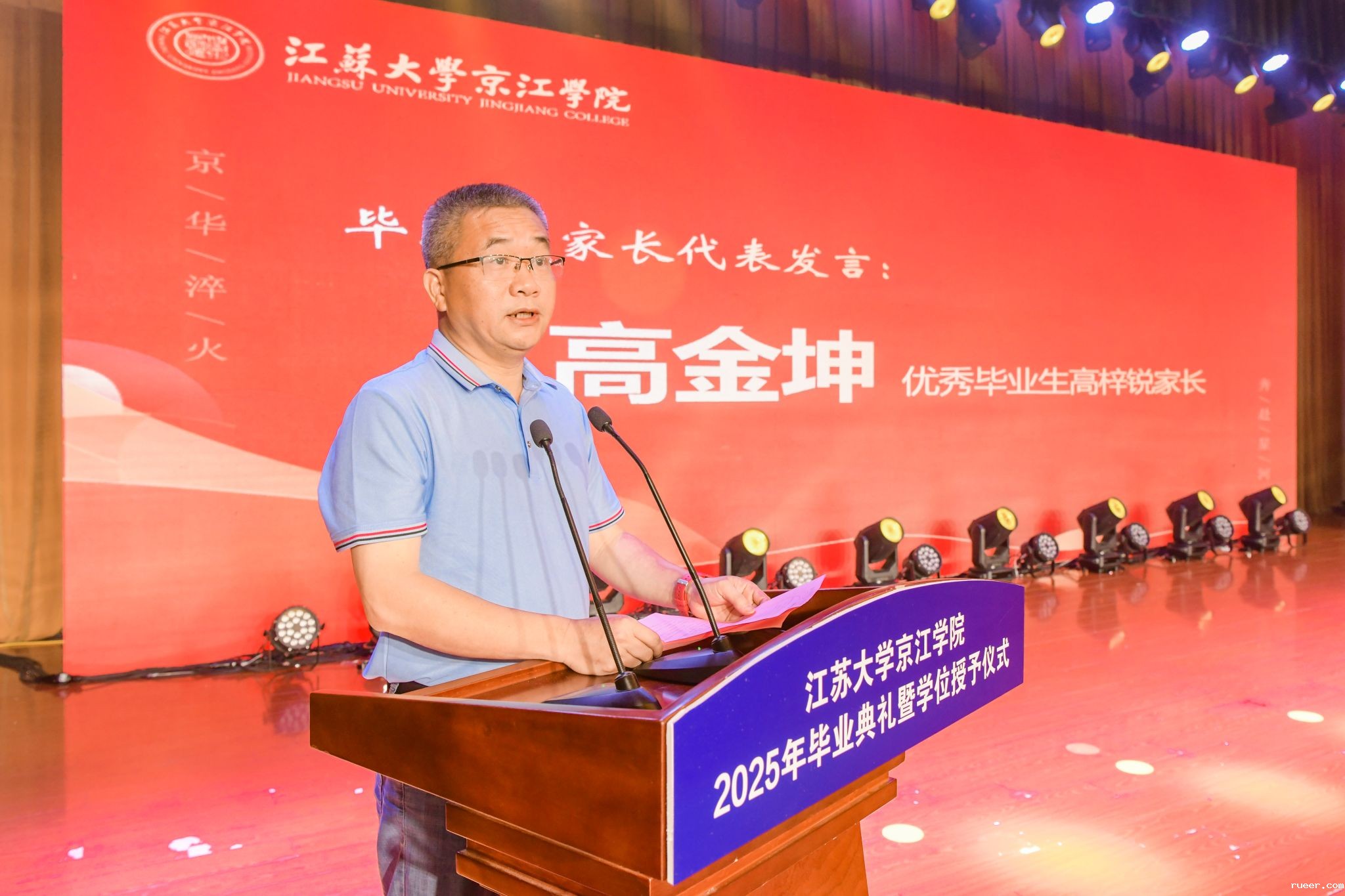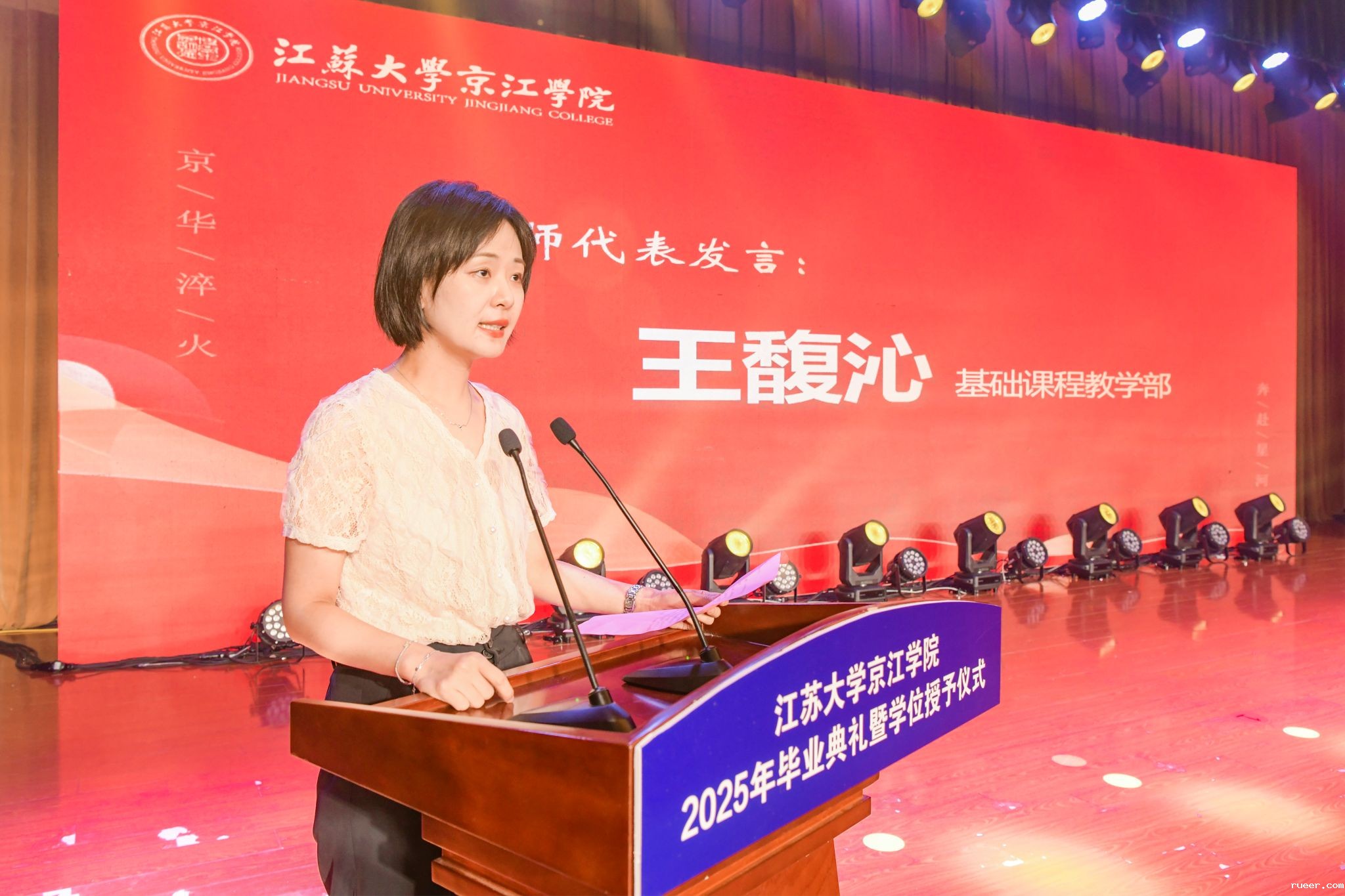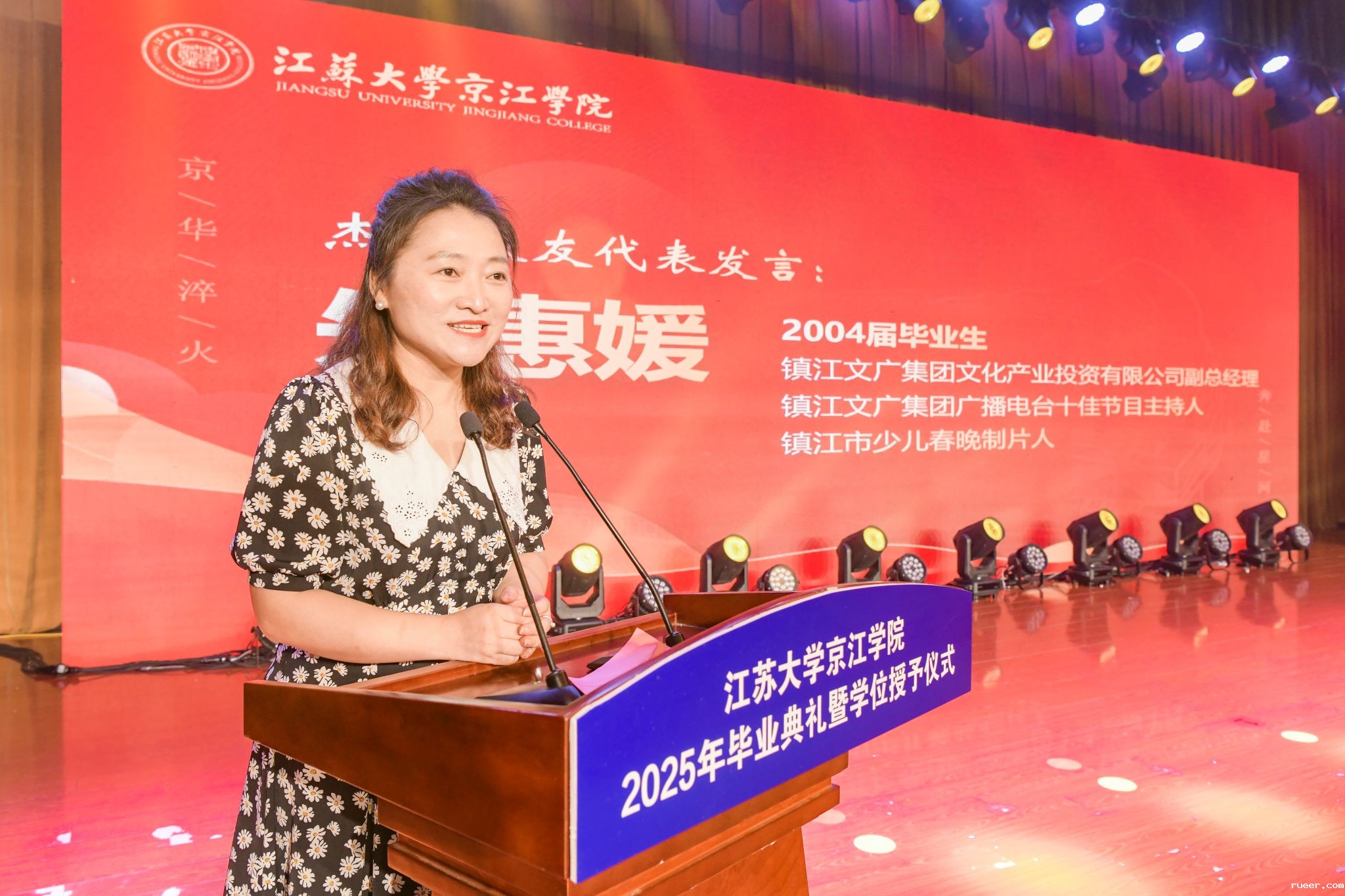 教师代表、基础课程教学部王馥沁老师,校友代表、镇江文广集团文化产业投资有限公司副总经理朱惠媛女士,家长代表、材料与土木工程学院优秀毕业生高梓锐家长高金坤先生,学生代表、财经学院优秀毕业生陈薇分别在典礼上发言。