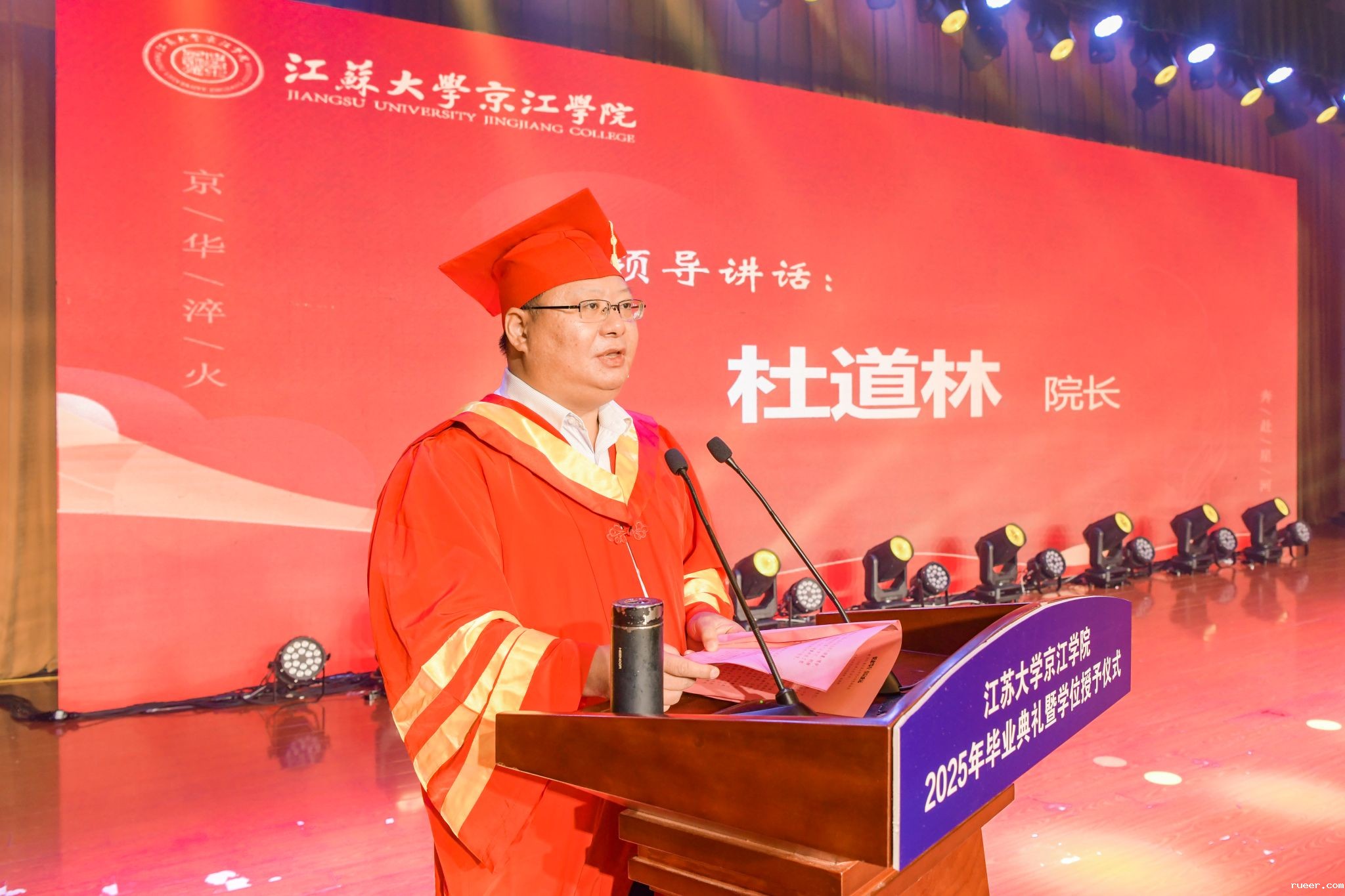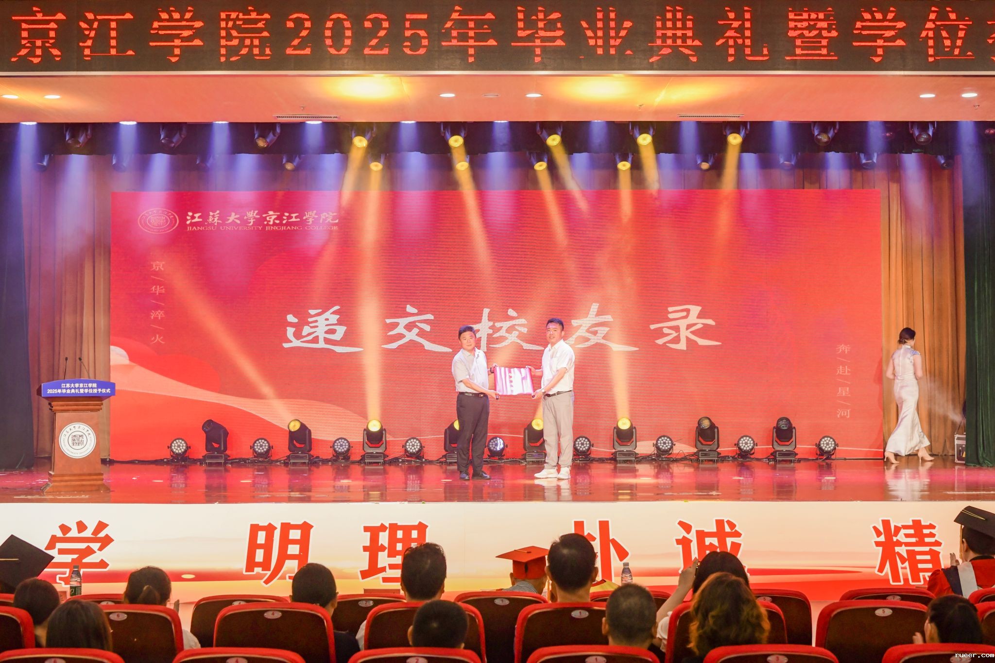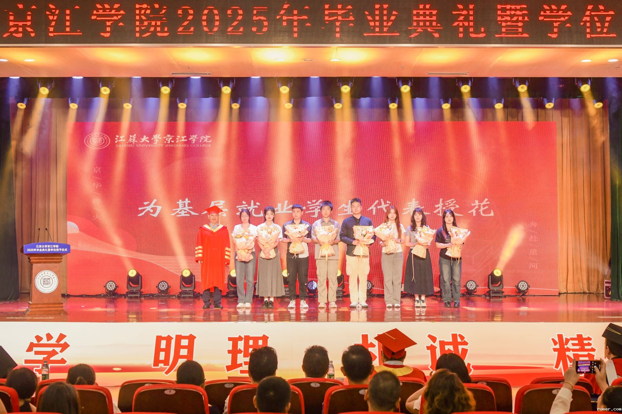 6月20日,伟德官网手机版2025年毕业典礼暨学位授予仪式在大学生活动中心多功能报告厅隆重举行。江苏大学校友总会秘书长李国昊和全体院领导出席典礼,相关职能部门和各二级学院主要负责人、教师代表、校友代表、家长代表、毕业生代表等参加典礼。京江学院党委副书记、纪委书记蒋豪主持典礼。